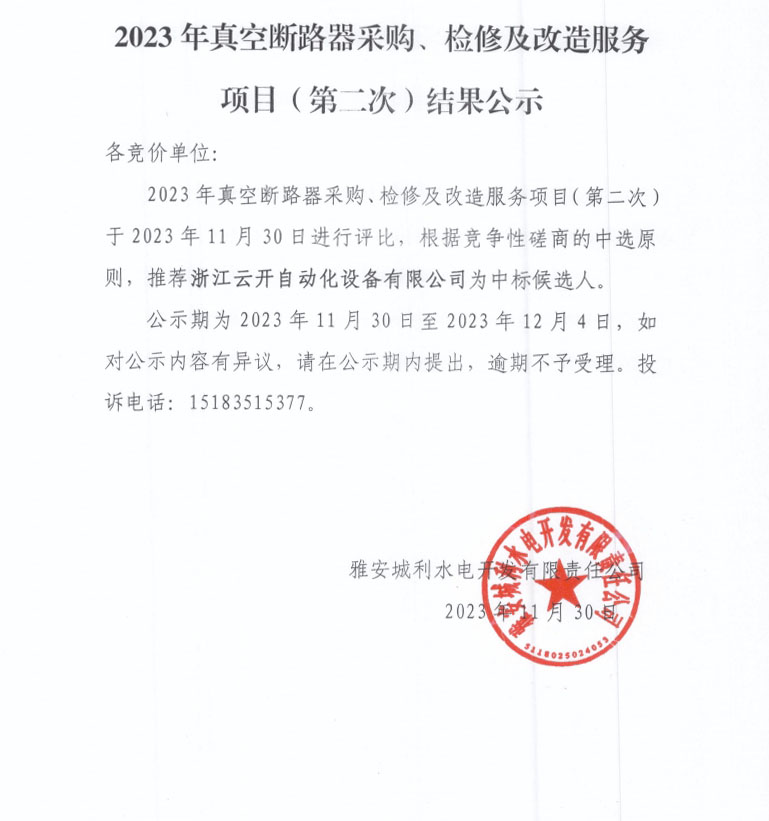 2023年真空斷路器采購、檢修及改造服務(wù)項目(第二次)結(jié)果公示