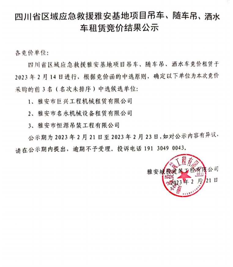 四川省區(qū)域應急救援雅安基地項目吊車、隨車吊、灑水車租賃競價結(jié)果公示