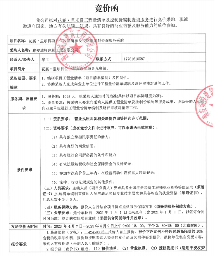 花襄·里項(xiàng)目工程量清單及招標(biāo)控制價編制咨詢服務(wù)采購競價公告