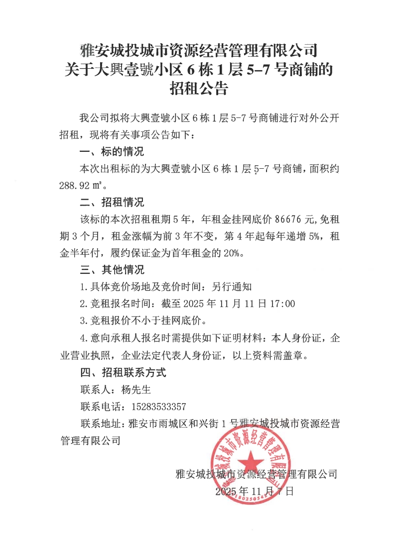 雅安城投城市資源經(jīng)營管理有限公司關于大興壹號小區(qū)6棟1層5-7號商鋪的招租公告