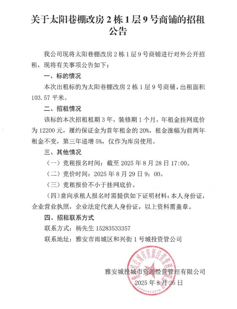 關(guān)于太陽巷棚改房2棟1層9號商鋪的招租公告
